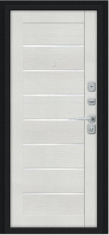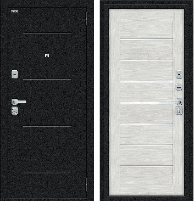 Надежная входная Дверь Браво Техно/BChrome Букле черное/Bianco Melinga премиум класса по цене 34 795 руб. Большая толщина стали защитит от проникновения в ваш дом, квартиру или коттедж. Используется очень качественная фурнитура: замки, цилиндры, ручки, защелки. Покрытие и отделка двери изготовлено под внимательным контролем производителя. Дверь имеет долгий срок службы и гарантию.